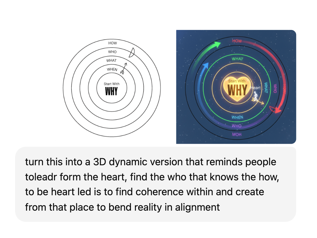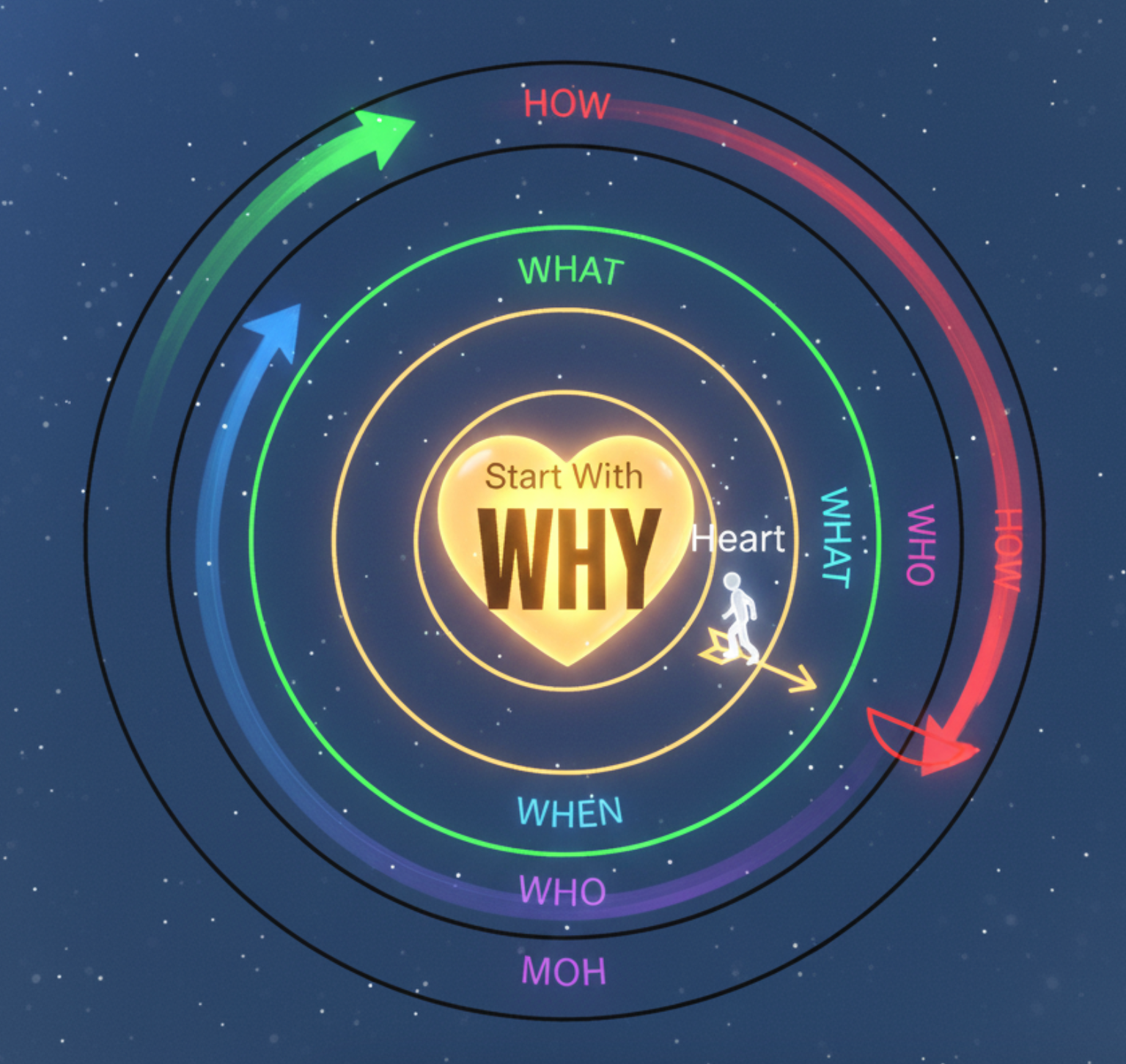 A living, 3D dynamic visual system showing concentric energy spheres radiating from a golden heart center labeled “Start With WHY.”