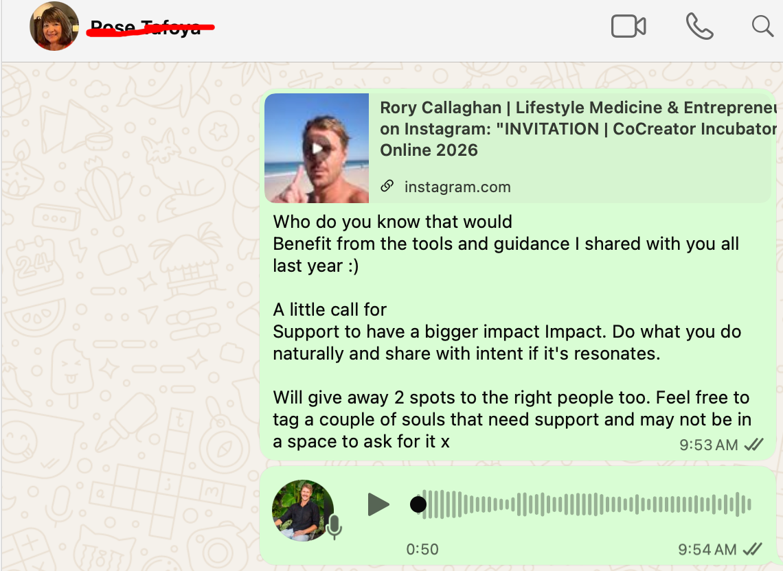 Send to people you have trust with, keep it personal voice notes best. Call is best. 2 mins x 100 people. Signal is sent to the universe. Give yourself 30 days +, 90 days optimal. 80% of people buy in 2 weeks and last 72 hours. Facts.