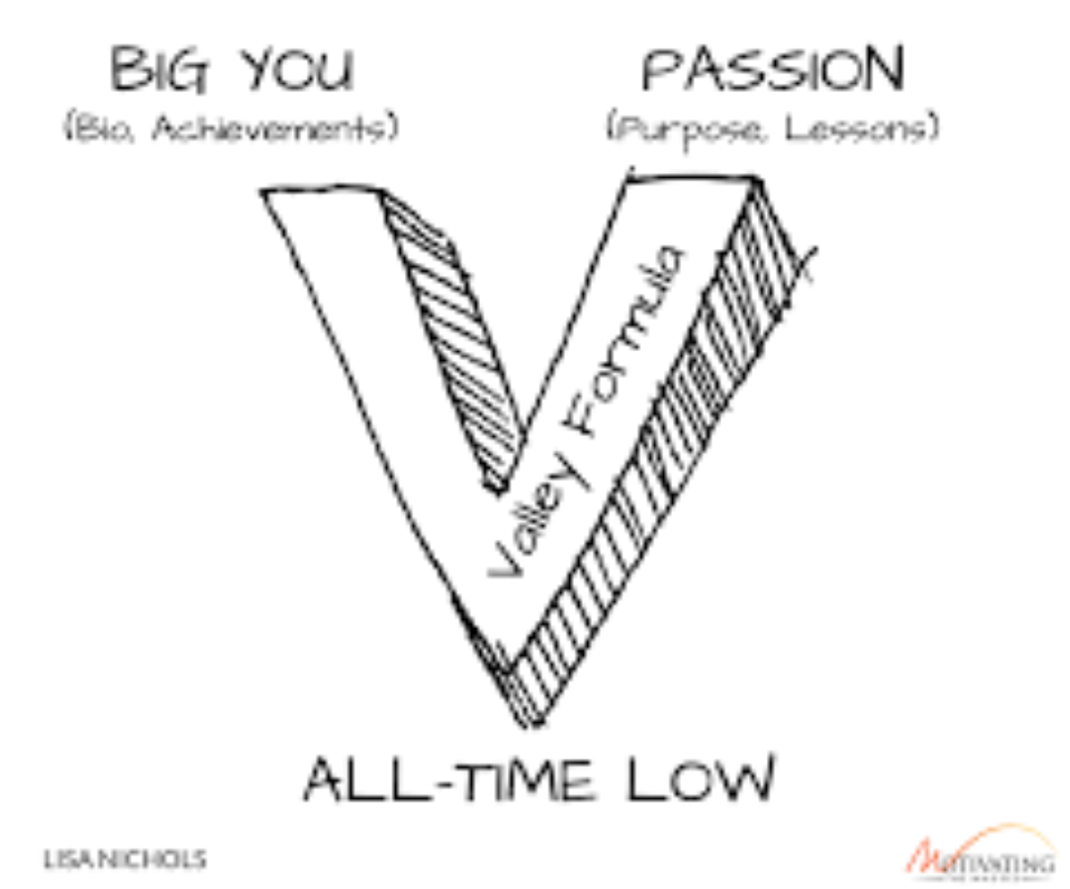 Begin by establishing your credibility. Share your achievements and successes to build trust with your audience. For example, you might say, "Even though I've authored seven bestsellers and spoken to over 86 million people..." This sets the stage for the journey you're about to share. - The Valley (Bottom Point of the V)
