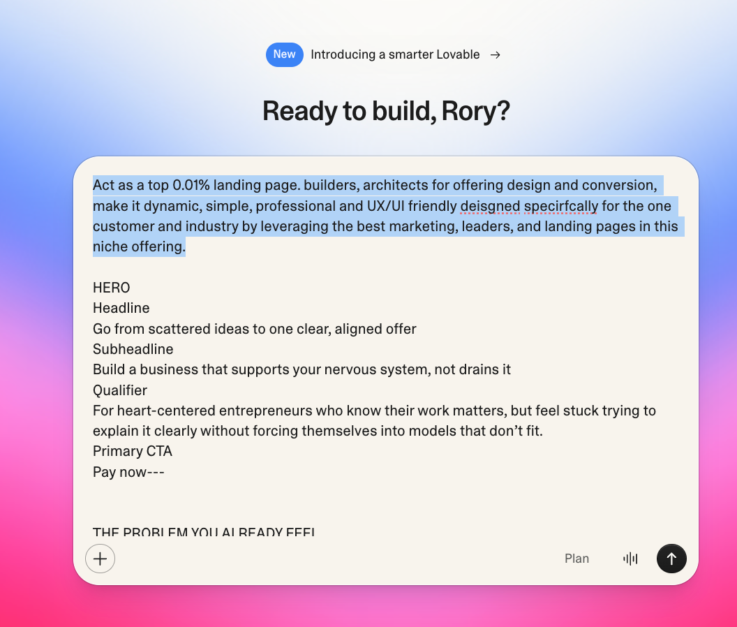 This agent helps a creator turn one offer for one person into a clear, professional landing page they can launch immediately using Lovable.
