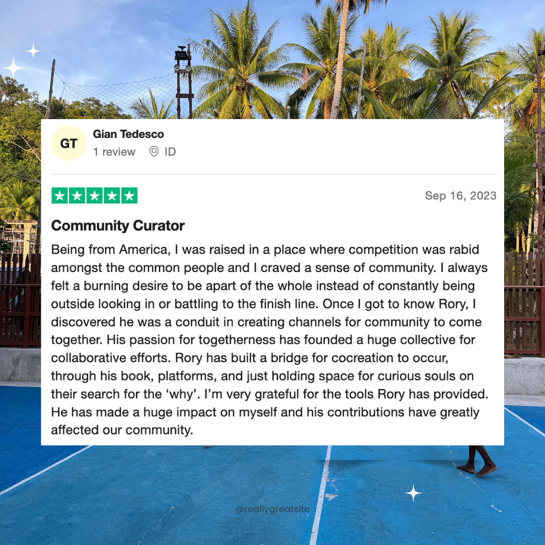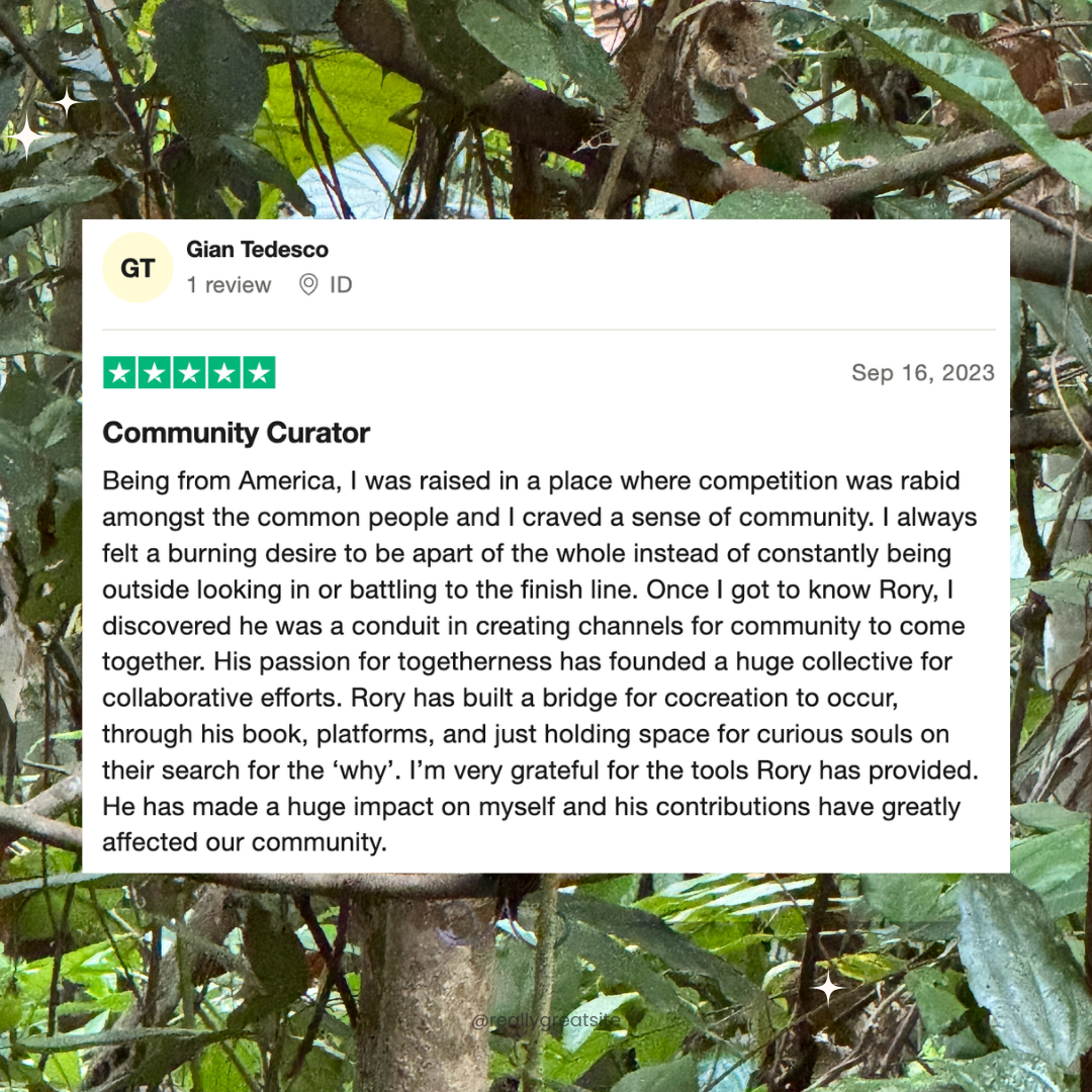 - Community building: Rory is praised for his focus on creating and nurturing communities, with reviewers appreciating his collaborative approach.