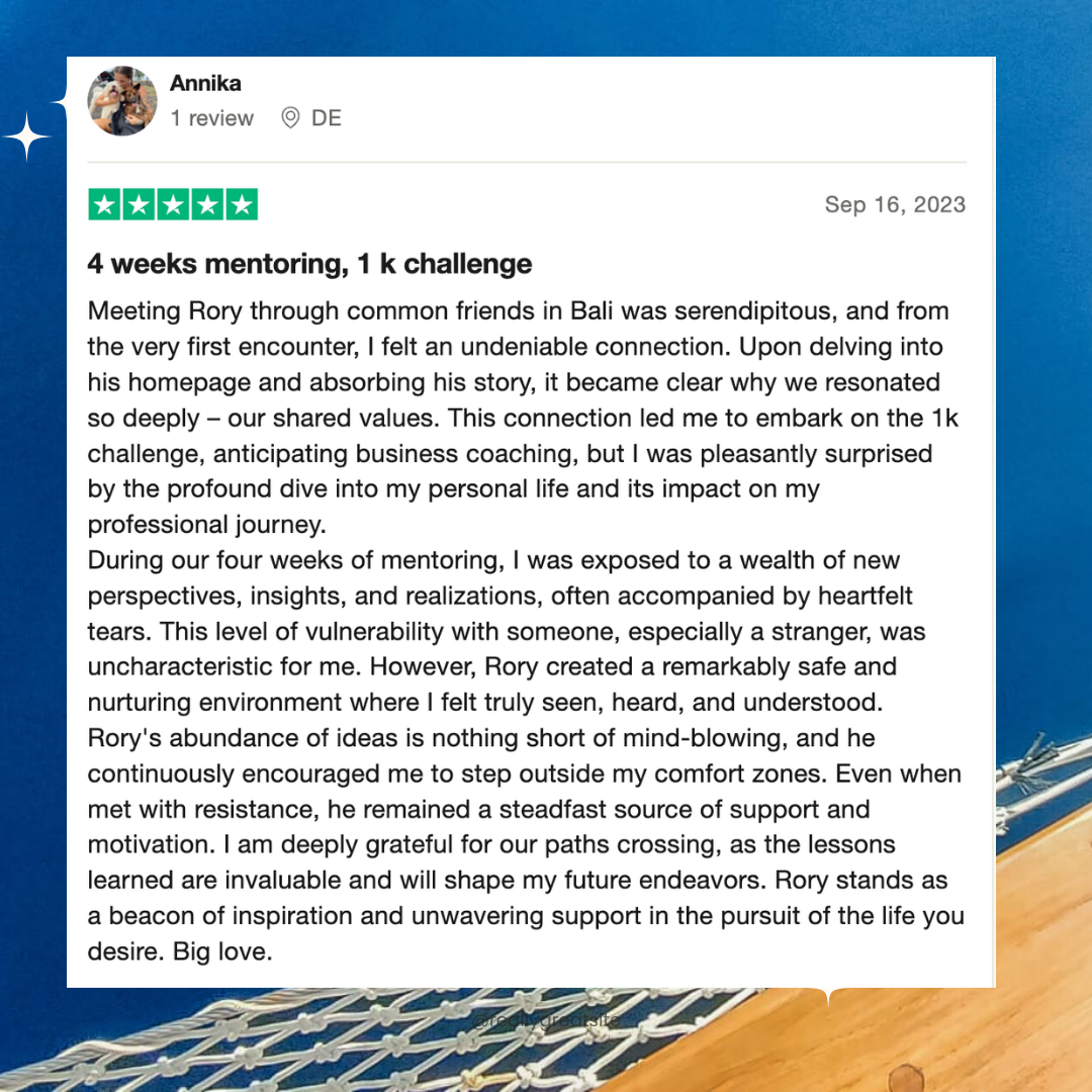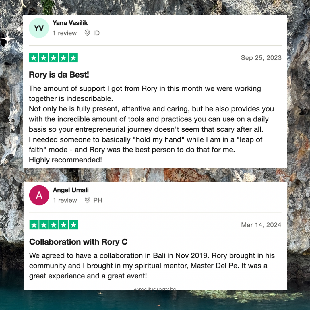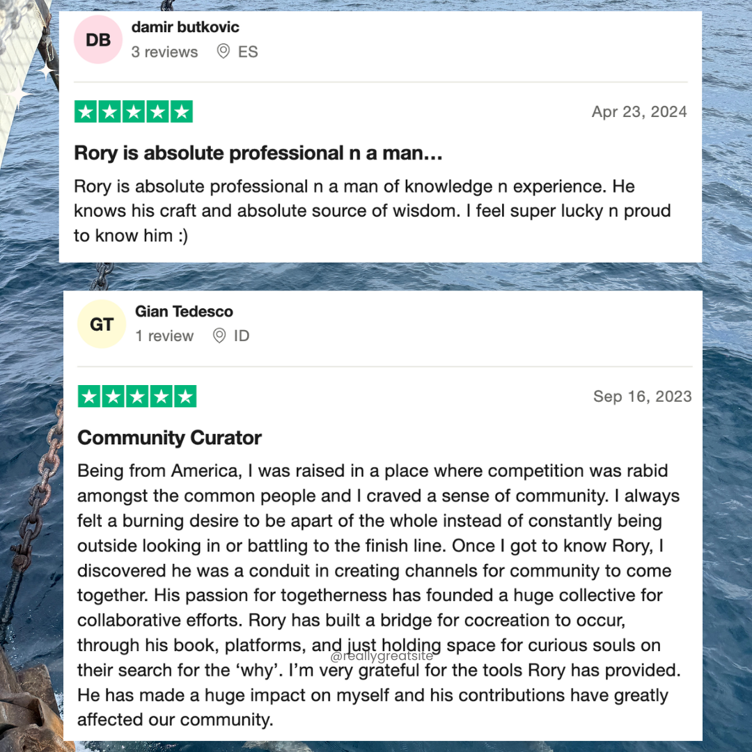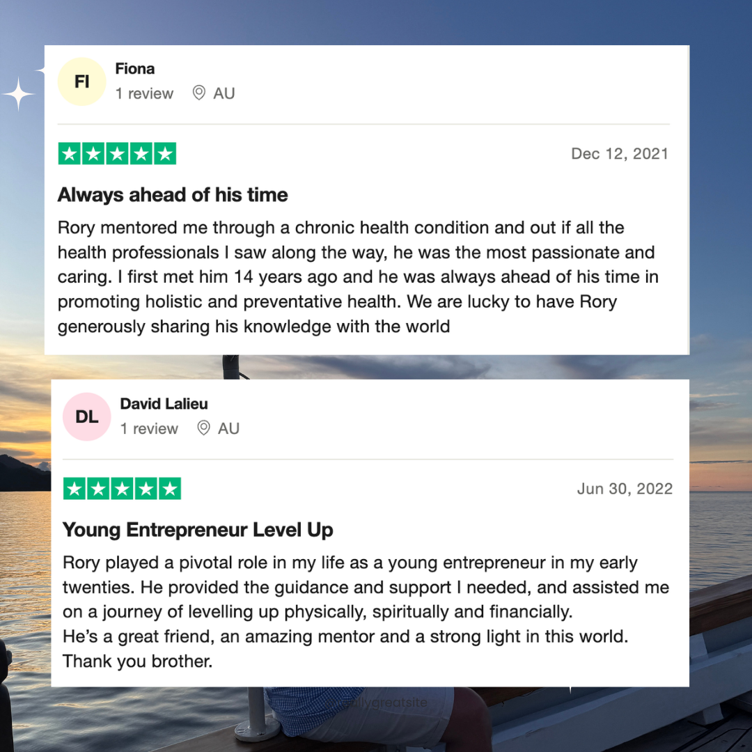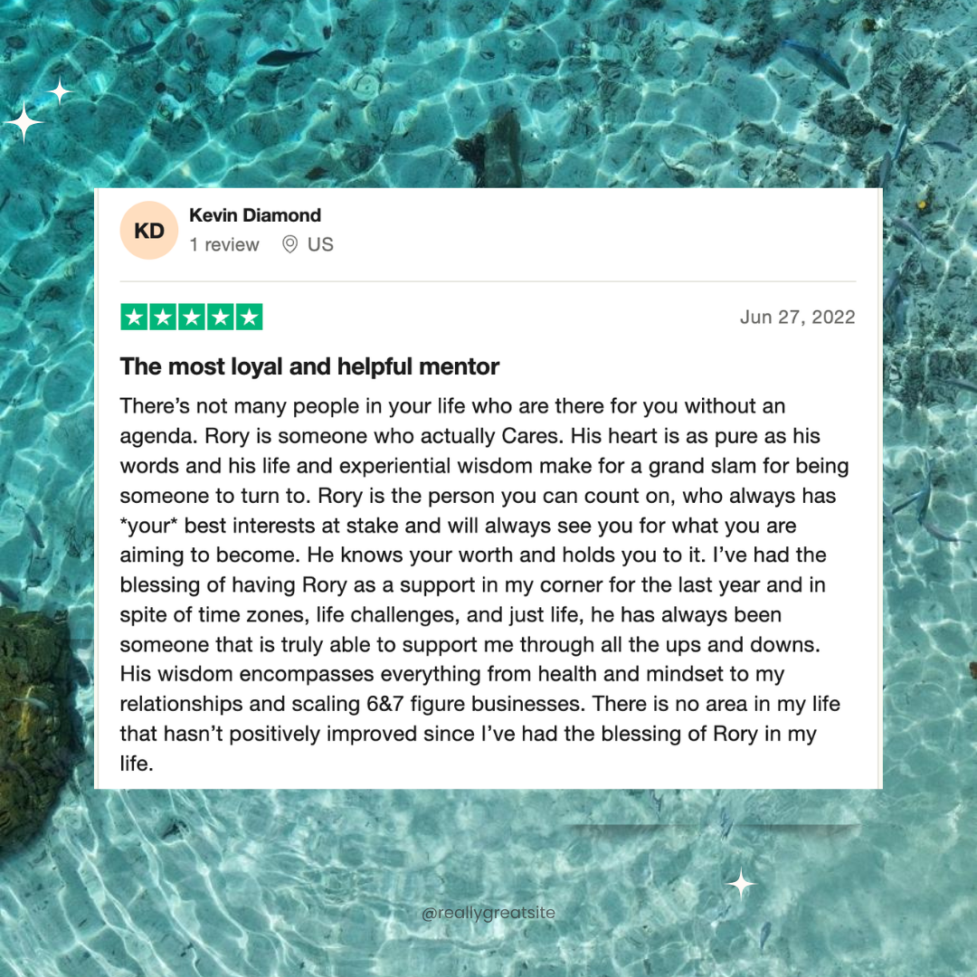 - Impactful mentorship: Several reviewers highlight Rory's skills as a mentor, noting his ability to provide guidance, support, and valuable tools for personal and professional growth.