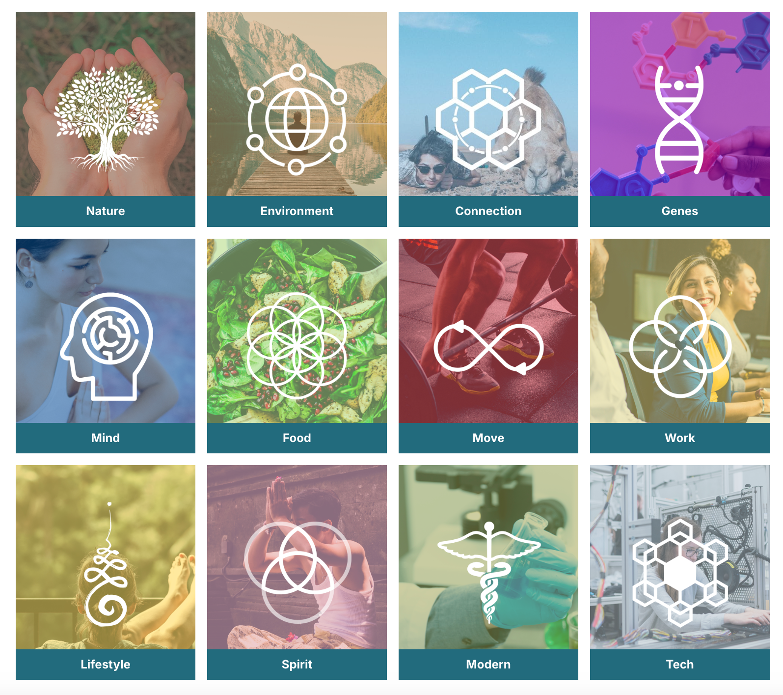 Nature, Connection, Genes, Environment, Mind, Food, Movement, Work, Lifestyle, Spirit, Modern, Technology.