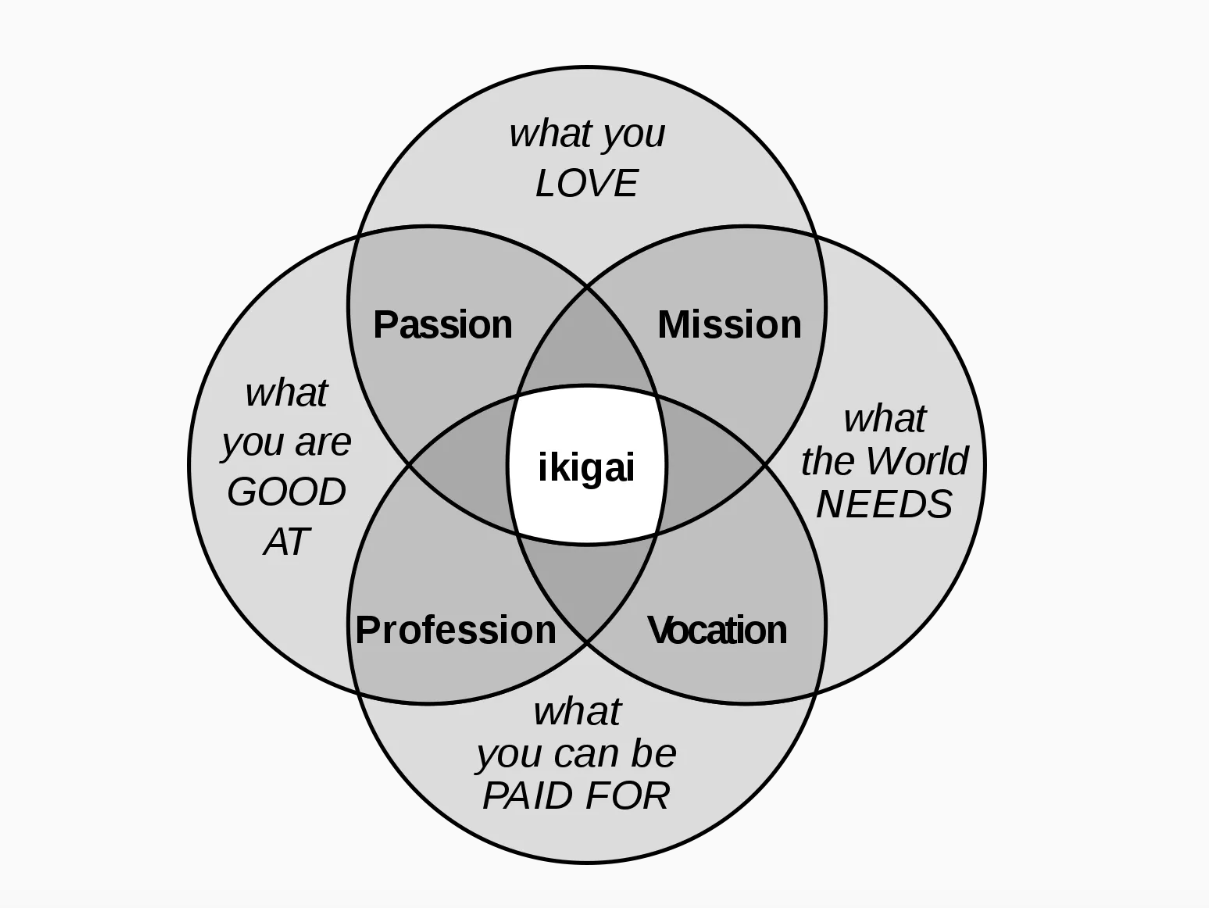 Ikigai, the intersection of heart, soul, purpose, passion, mission, skills and exchange of value
